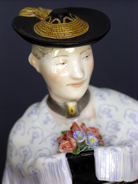 ヨーロッパの窯の東洋人フィギュアは、どうしても西洋風が伺えて違和感があるのですが、このフィギュアは顔の表情や着物の絵付け、ポーズなど、とても日本的です。背中の羽織に帯が描かれているのはご愛敬!