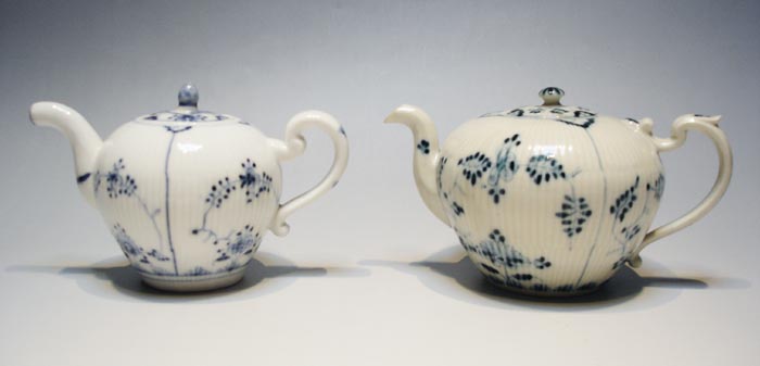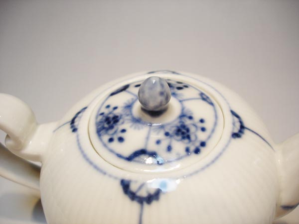 リブレリーフと釉下彩の青でインドの花(花麦藁)装飾のティーポット