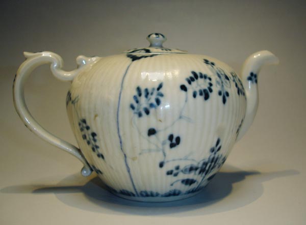 Teekanne mit Rippenrelief und unterglasurblauen Indianischen Blumen (Strohblumen)