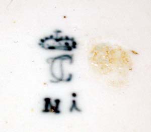 釉下彩の青で、選帝侯冠にCTと三つのドット