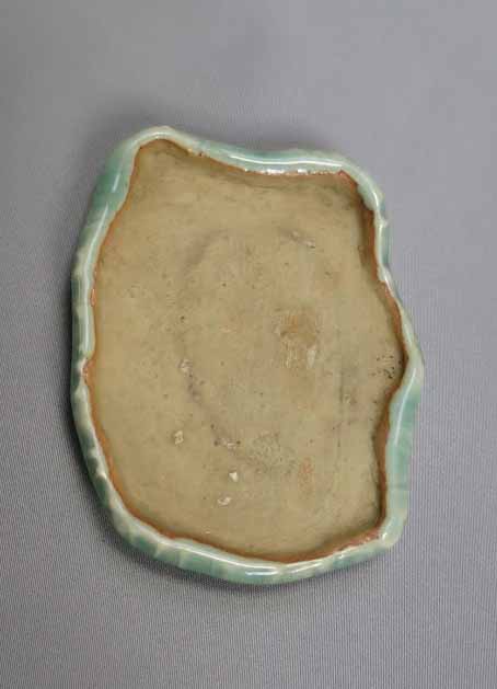 縦8.9cm横6.9cmの小さな可愛い硯ですが、さすがにうまいです。蓮の葉に蟹の面が裏で表は硯になっており、池もあり墨が摺られた後もあります。日本でも7世紀から11世紀頃までは陶器の硯が主流だったといいますから、昔はもっとあったのでしょうが、正直これはとても墨をする気にならず、煎茶道の方が床に飾ったものではないでしょうか?