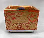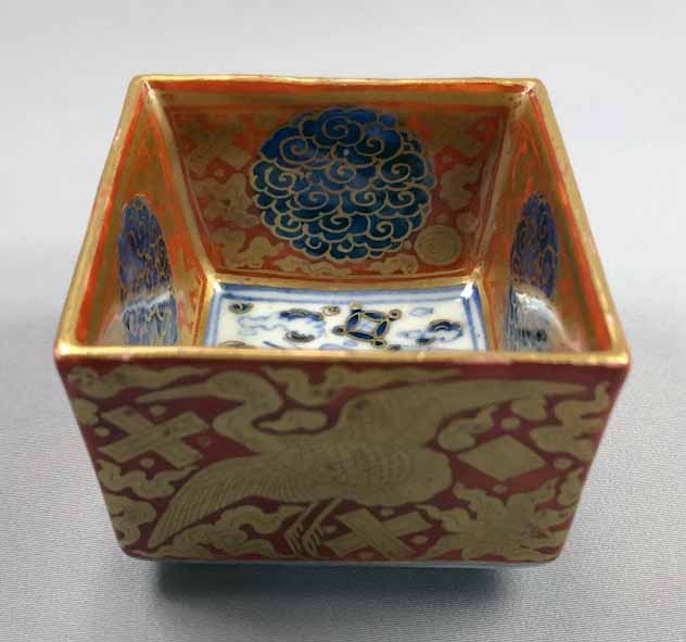 浅井一毫の赤絵金襴雲鶴盃です。これとまったく同じ金襴雲鶴の絵付けの永楽和全の馬上杯が九谷美術館にあります。