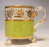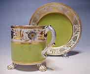 マーク: 釉下に青で描かれた双剣と星 釉上に黒で『97』蛇を象ったハンドルにライオンの足で支えられたコーヒーカン。美しいアップルグリーンのグランドカラーに、金彩とプラチナ彩の装飾が加えられたこのカップ・ソーサーは、アンピール様式の勇ましい装飾や、ナポレオンの好んだシェーレ・グリーン(Scheele's Grun)を彷彿とさせるグランドカラーといい、恐らく神聖ローマ帝国が崩壊し、1806年にザクセン王国となった時代のものと考えられます。