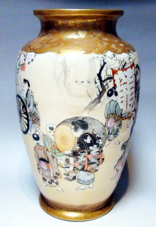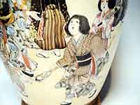 子供達がお正月遊戯に興じる様子が描かれたこの花瓶は、明治時代の向陽舎で制作されたものである。金彩の仕方等は九谷系の作品と思われる。アメリカからの里帰りの作品である。