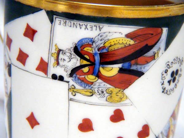 フランスのパリでは、王室の金細工師、マル・セティエンヌ・ジャヌティ(Marc Etienne Janety)が、クラップロートに少し遅れて、宝飾品へのプラチナ装飾に成功し、更にコレージュ・ド・フランス(College de France)の化学教授で、セーヴル窯の技術ディレクターを務めていた、ジャン・ダクレ(Jean D’Acret)が1791年に、この磁器へのプラチナ装飾技術を実現しました。さてこの作品では、金彩、プラチナ彩で、当時導入した印刷技術によって装飾されています。この時代、王は多くの功労者に、磁器の作品を下賜する必要があり、この印刷技術によって、大量にしかも安価に、御下賜品の制作が行われたそうです。