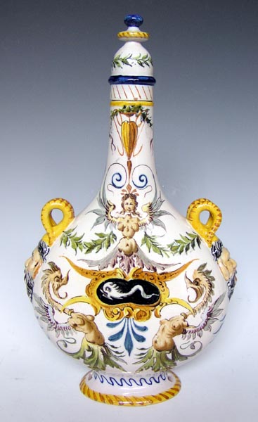 フラスク(扁壺)は高さ28cm、小皿は長径15cm、ベースは高さ15cmです。いわゆるグロテスク柄ものですが、奔放な筆遣いがおおらかなイタリアっぽくて何故か惹かれてしまいます。