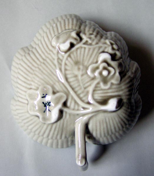 今までバタビア手はカップ&ソーサーしか見たことがなく(青磁釉バタビアのカップ&ソーサーはhiroさんがお持ちです)、このディッシュを見つけたことでティーセット等他の器形もあるかも知れないと探求心をそそられています。こういった少し深みのある小さな葉っぱ形のディッシュは、指が通るハンドルがあるものをbutterboat、ハンドルが無いものをpickles dishと呼んでおり、裏側には草花の浮き彫りがあるものが多いようです。