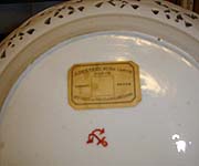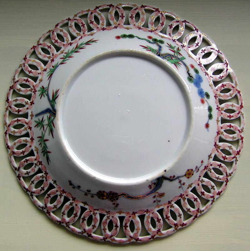 窯印は朱色の錨で、チェルシー窯よりも大きく、上部に輪っかが一つ余分についています。この窯印は必須でなく、また軟質でも硬質でも、この窯印のついた作品が存在しています。この2枚のお皿は、軟質のペーストでできており、おそらく最も初期の作品ではないかと、思われます。