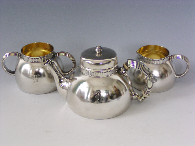 ハンドルの形状やつまみなどはデコっぽく、ポットハンドルの釘隠しのような装飾は日本風、ポット注ぎ口は生物的でヌーボー風のように思えます。ホールマークから1880年製で間違いなく、ということは日本趣味なのでしょうか?