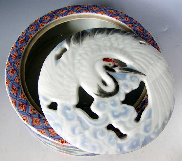 火屋にあしらわれた鶴が洒落ており、雲の染付けの色合いもとても良いです。本体は窓に松竹梅が描かれています。